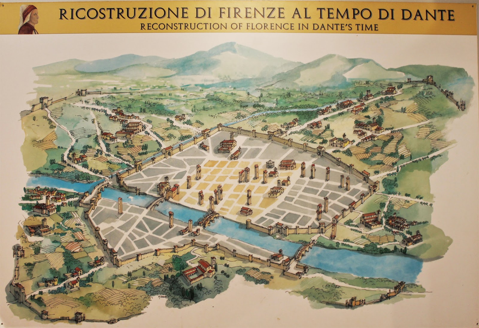 | Florença no tempo de Dante: a cidade passava por uma grande transformação, com a construção da nova e última muralha, do Duomo de Santa Maria del Fiore e do Palazzo Vecchio. |